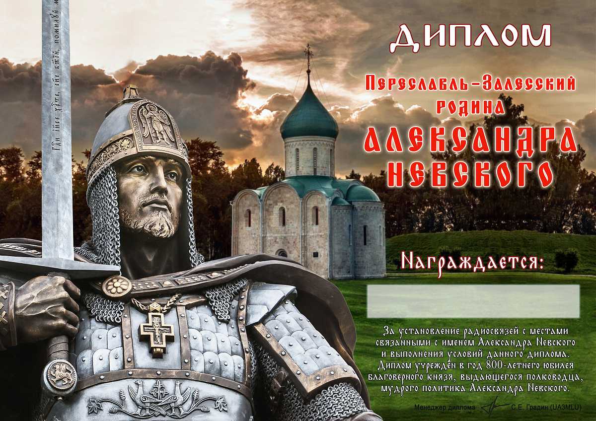 Но, пожалуй, самое значимое имя, которое известно практически каждому жителю нашей страны - это имя Святого благоверного князя, выдающегося полководца и мудрого политика Александра Невского. В год 800 летнего юбилея со дня рождения Александра Невского радиоклуб города Переславля-Залесского учредил постоянно действующий диплом «Переславль-Залесский – родина Александра Невского».